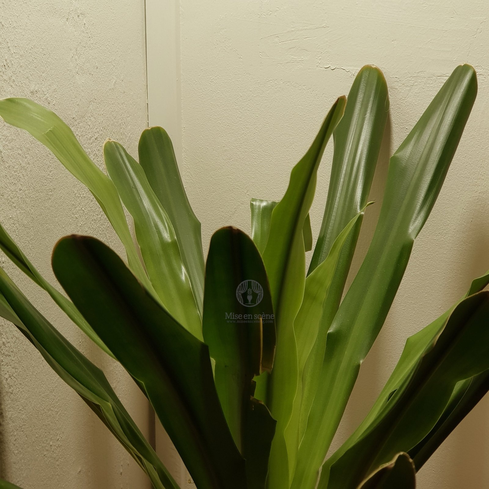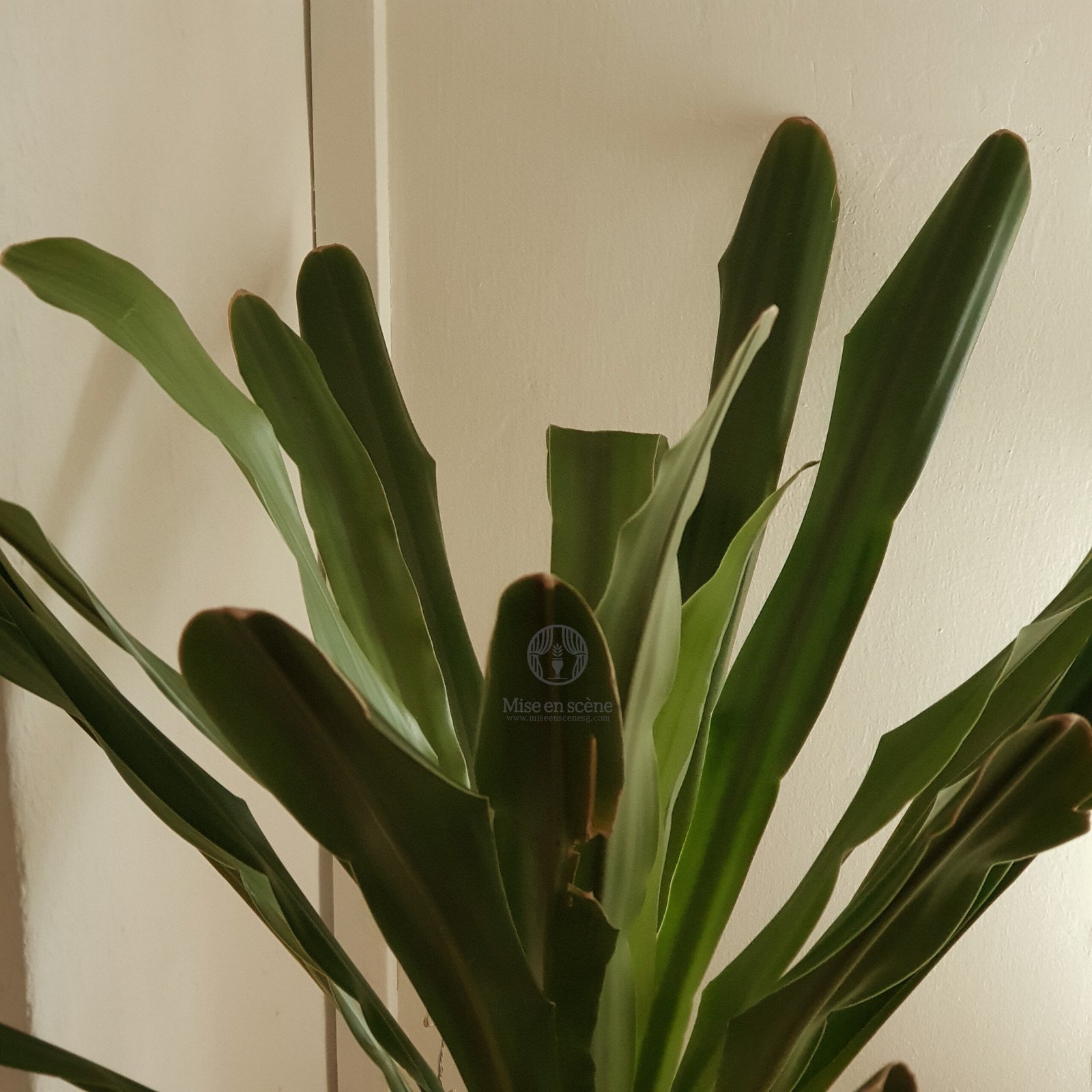 A Dracaena Gymis is lit only by natural light streaming in from a window next to it. The PPFD measurement at the leaf surface was about 11 μmol/m²/s.